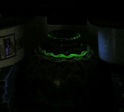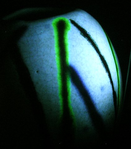 Angeregt durch den Hinweis meines Uranglasur-Sammel-Freundes Ernst aus Wunsiedel, kann es nicht verkehrt sein, auch einmal die Glasuren mit UV-Licht zu prüfen...