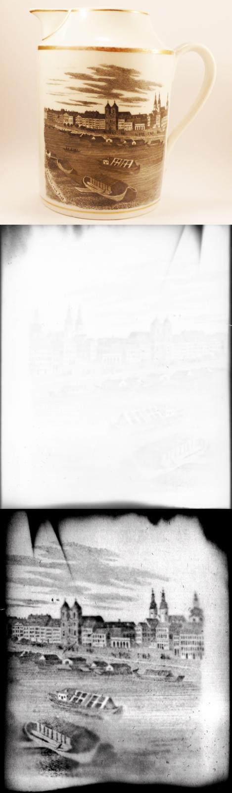 Schlaggenwald-Kanne im Original, in der Radiografie und zuletzt etwas nachbearbeitet und wieder seitenrichtig gedreht...